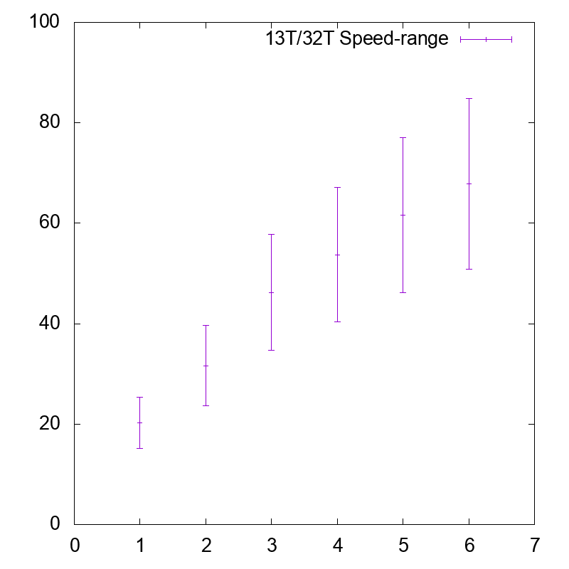 在巿區騎乘,可能會用到5檔,有人不喜歡要換這麼多檔。可是看後面的檔位,速度範圍比較大,表示比較不會因為轉速變化讓速度有挫頓感。換成這齒比,就是抱定平常不騎到 90以上了,若要騎到 90就要稍微拉轉一下。